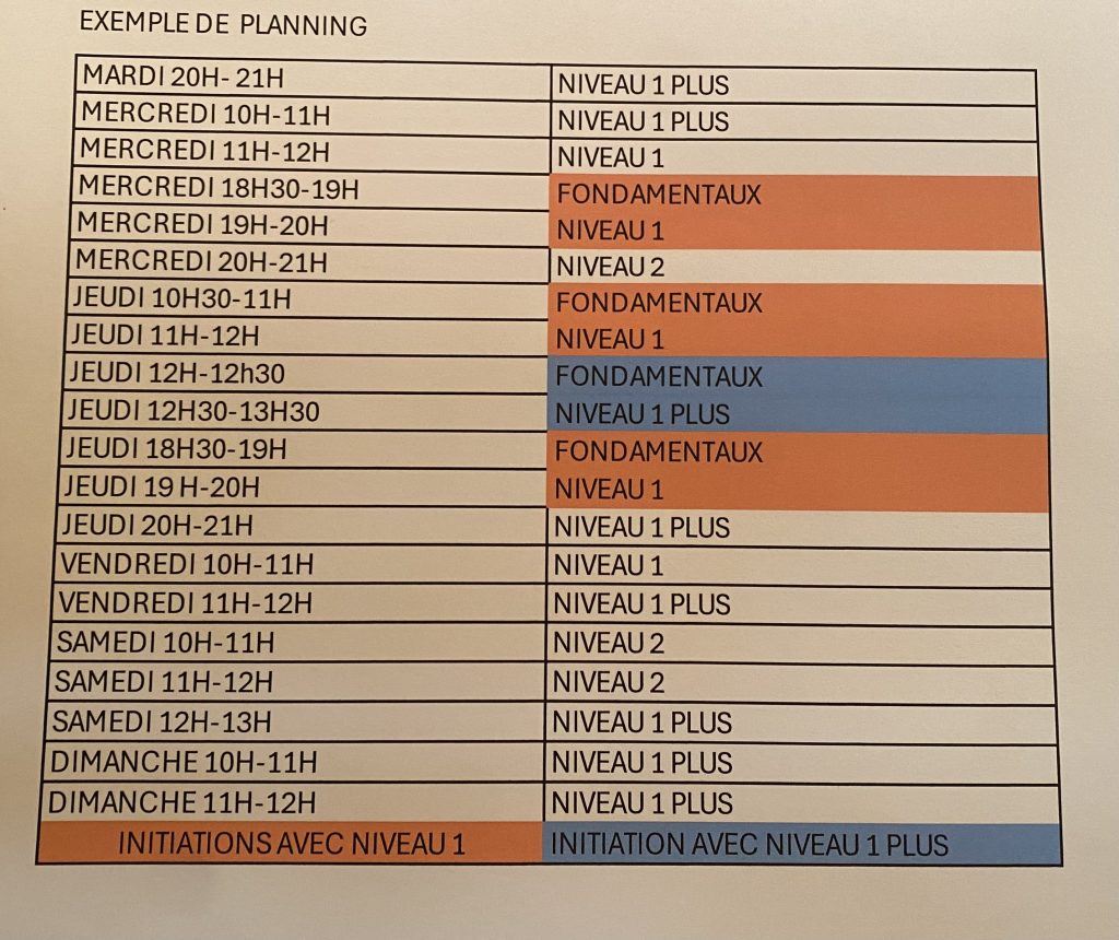 Choisissez votre créneau horaire sur le planning : il vous faut un cours de FONDAMENTAUX suivi d’un cours NIVEAU 1.